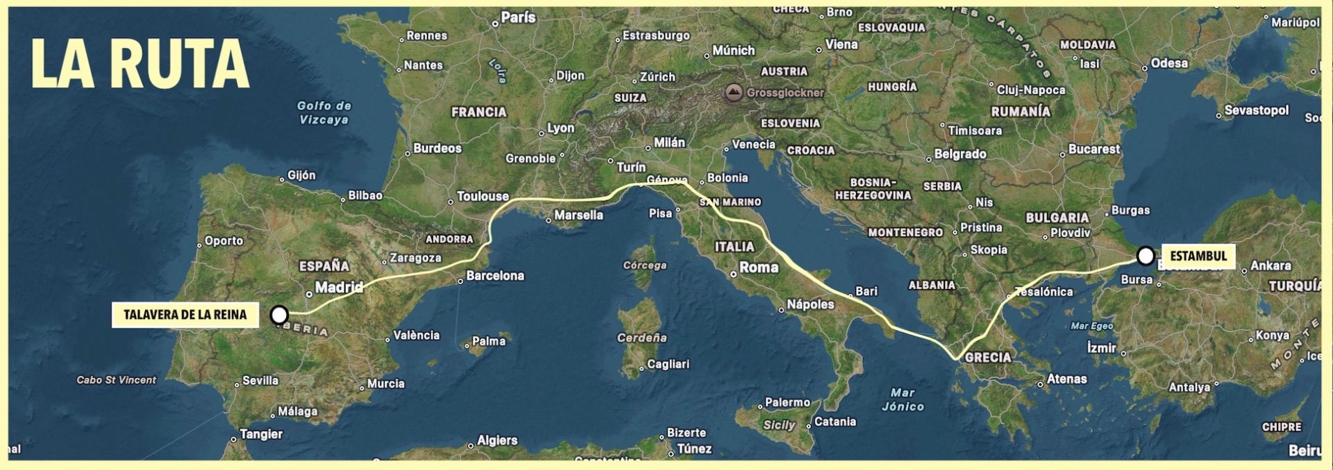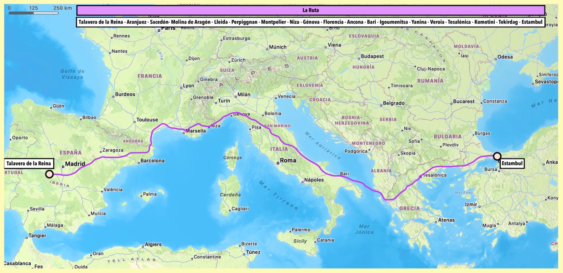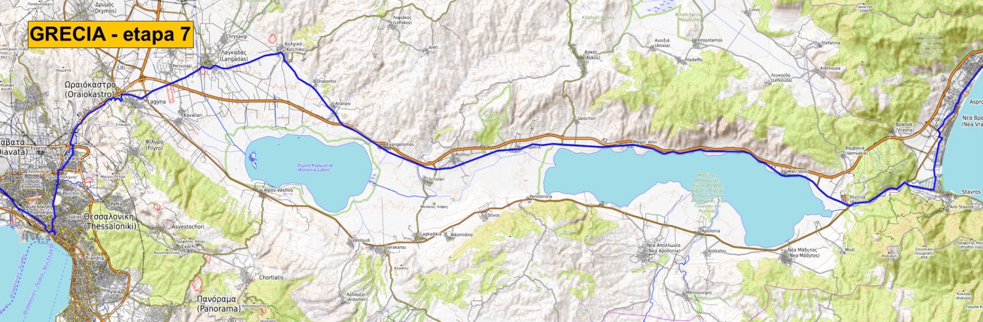 20 DE JUNIO Talavera de la Reina - ARANJUEZ (120km) - Sacedón (120km) - Molina de Aragón (112km) - Calamocha (70km) - Albalate/La Puebla de Híjar (102-120 km) - Fabara/Nonaspe (85-95km) - LLEIDA (90km) - Suria (132km) - Sant Joan de les Abadesses (96km) / (ESP: 9 ETAPAS) / EV-8: PERPIGNAN (109km) - Narbona (86km) - Séte (80km) - Saint Gilles (94km) - Mallemort (74km) - Draguignan (85km) - Cannes (80km) / (FRA: 7 ETAPAS) / San Remo (89km) - Savonna (98km) - GÉNOVA (50km) - Sestri Levante (52km) - La Spezia (63km) - Pisa (90km) - FLORENCIA (100km) - Premicuore (73km) - Rímini (90km) - Ancona (101km) - San Benedetto del Tronto (90Km) - Pescara (90Km) - Termoli (100km) - San Severo (60km) - Barleta (115km) - Bari (59km) - Ostuni (91km) - Brindisi (43km) 5 DE AGOSTO / (ITA: 18 ETAPAS) / Igoumenitsa (Ferry) - Yanina (90km) - Metsovo (62km) - Grevená (60km) - Kozáni (66km) - Veroia (62km) - TESALÓNICA (79km) - Stavros (80km) - Kavála (84km) - Iasmos (83km) - ALEJANDRÓPOLIS (83km) 17 DE AGOSTO / (GRE: 11 ETAPAS) / Ipsala (58 km) - Salgamli (73km) - TEKIRDAG (56km) - Silivri (74km) - ESTAMBUL (74km) / (TUR: 5 ETAPAS)