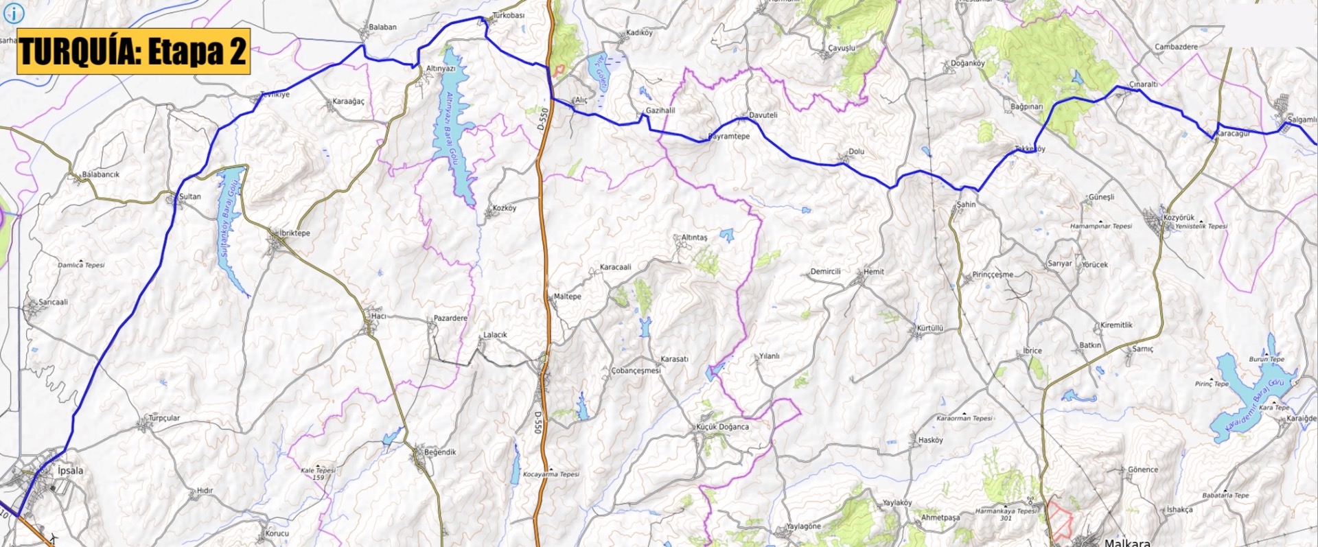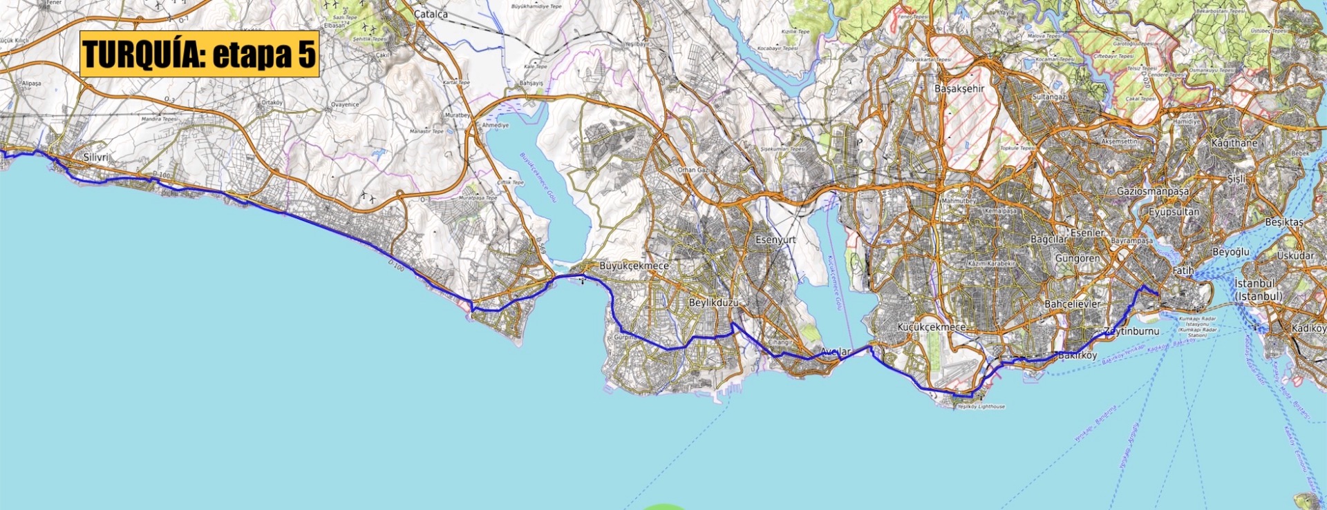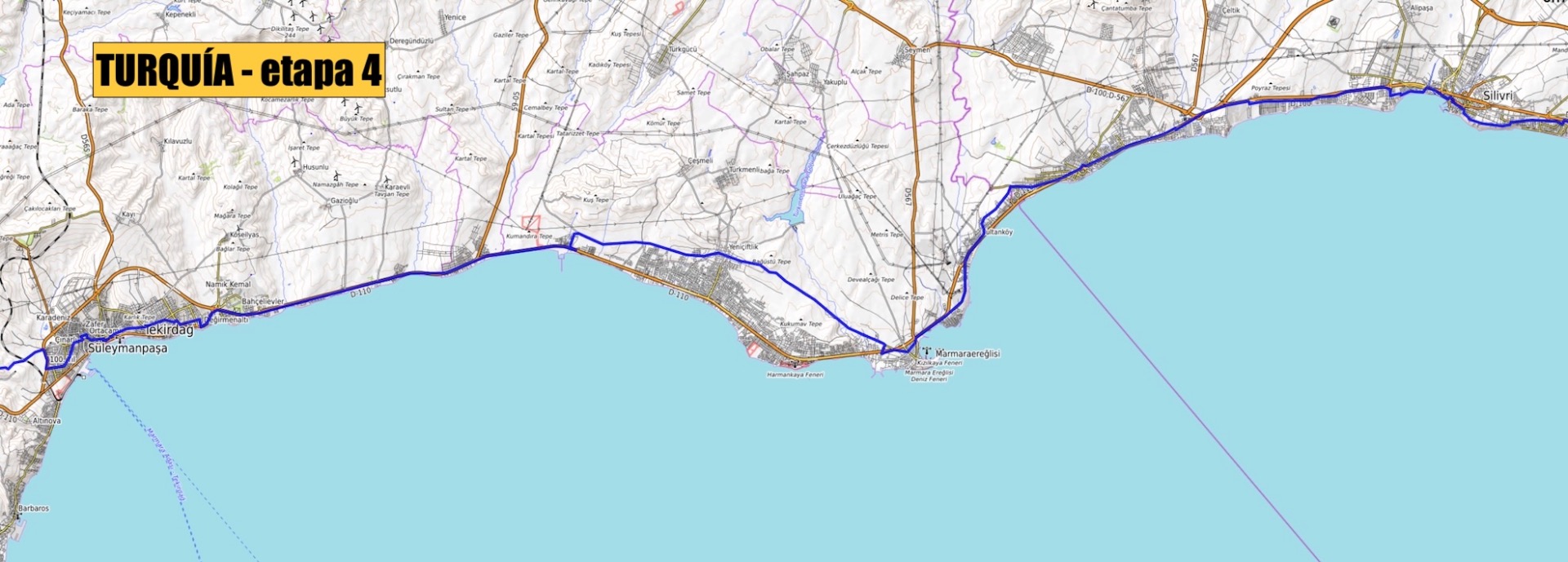 20 DE JUNIO Talavera de la Reina - ARANJUEZ (120km) - Sacedón (120km) - Molina de Aragón (112km) - Calamocha (70km) - Albalate/La Puebla de Híjar (102-120 km) - Fabara/Nonaspe (85-95km) - LLEIDA (90km) - Suria (132km) - Sant Joan de les Abadesses (96km) / (ESP: 9 ETAPAS) / EV-8: PERPIGNAN (109km) - Narbona (86km) - Séte (80km) - Saint Gilles (94km) - Mallemort (74km) - Draguignan (85km) - Cannes (80km) / (FRA: 7 ETAPAS) / San Remo (89km) - Savonna (98km) - GÉNOVA (50km) - Sestri Levante (52km) - La Spezia (63km) - Pisa (90km) - FLORENCIA (100km) - Premicuore (73km) - Rímini (90km) - Ancona (101km) - San Benedetto del Tronto (90Km) - Pescara (90Km) - Termoli (100km) - San Severo (60km) - Barleta (115km) - Bari (59km) - Ostuni (91km) - Brindisi (43km) 5 DE AGOSTO / (ITA: 18 ETAPAS) / Igoumenitsa (Ferry) - Yanina (90km) - Metsovo (62km) - Grevená (60km) - Kozáni (66km) - Veroia (62km) - TESALÓNICA (79km) - Stavros (80km) - Kavála (84km) - Iasmos (83km) - ALEJANDRÓPOLIS (83km) 17 DE AGOSTO / (GRE: 11 ETAPAS) / Ipsala (58 km) - Salgamli (73km) - TEKIRDAG (56km) - Silivri (74km) - ESTAMBUL (74km) / (TUR: 5 ETAPAS)