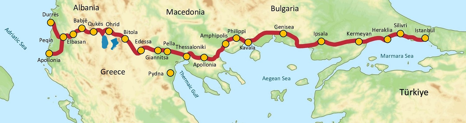- Ruta: Recorría aproximadamente 1,120 km (casi 700 millas) desde los puertos de Dyrrachium (Durrës, Albania) y Apollonia en el mar Adriático hasta Bizancio(Estambul, Turquía).